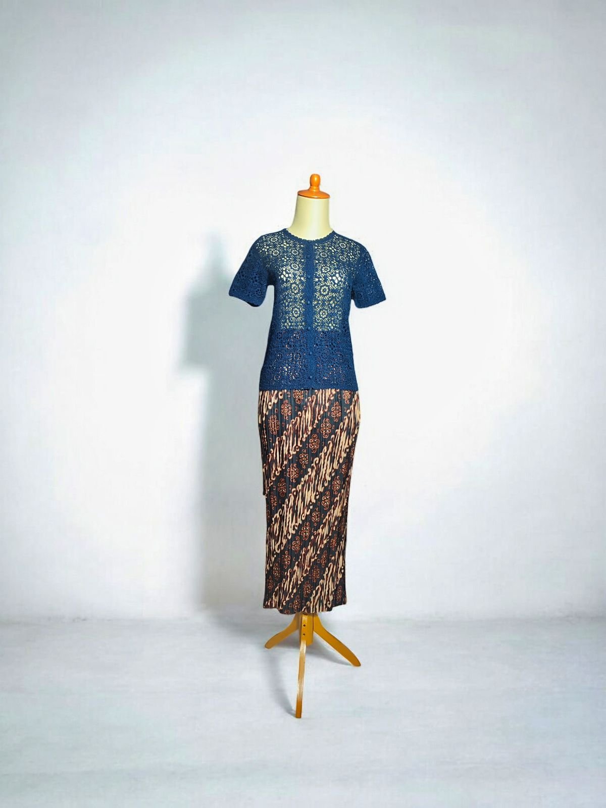 Kebaya modern dari bahan renda atau rajutan dengan motif bunga (floral) yang memberikan kesan feminin dan segar. Bahan ini semi-transparan, yang merupakan ciri khas umum kebaya. atasan berlengan pendek dengan bukaan depan penuh menggunakan kancing, mirip kardigan atau blus berkancing. Meskipun mempertahankan esensi kebaya sebagai atasan tipis, desainnya yang sederhana dan modern membuatnya cocok untuk berbagai acara, baik formal maupun santai. Warna biru pekat memberikan tampilan yang elegan.