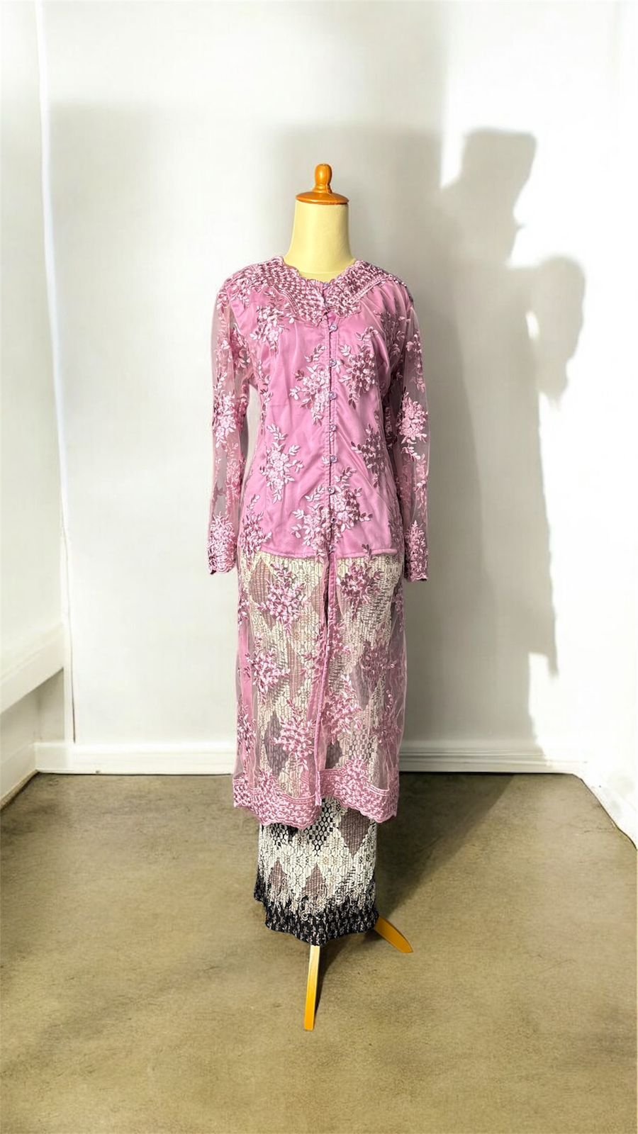 Kebaya moderen tunik brokat kebaya ini mengadopsi gaya kontemporer dengan potongan panjang yang menyerupai tunik atau outer, berbeda dari kebaya tradisional yang biasanya lebih pendek dan pas badan. Terbuat dari bahan brokat tile cornely yang tembus pandang dengan sulaman bunga-bunga berwarna lavender, memberikan kesan mewah dan elegan. Panjang kebaya mencapai betis, membuatnya cocok dipadukan dengan rok atau celana panjang untuk acara formal maupun semi-formal. Terdapat bukaan depan dengan kancing, yang merupakan fitur umum pada beberapa model kebaya modern atau tunik.