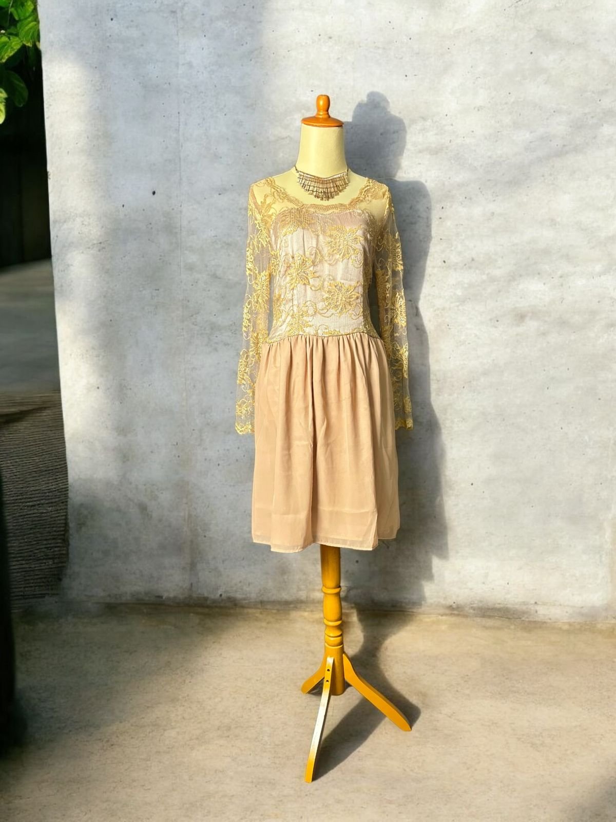 Dress kebaya modern pendek dengan bagian atas gaun terbuat dari bahan brokat atau renda berwarna emas dengan lengan panjang, memberikan kesan elegan dan tradisional. Terdapat jahitan di bagian pinggang yang memisahkan atasan ketat dengan rok yang lebih longgar, mirip dengan gaya peplum atau empire. Bagian rok berwarna krem atau beige dengan potongan pendek di atas lutut, memberikan sentuhan modern pada pakaian bergaya kebaya tradisional.