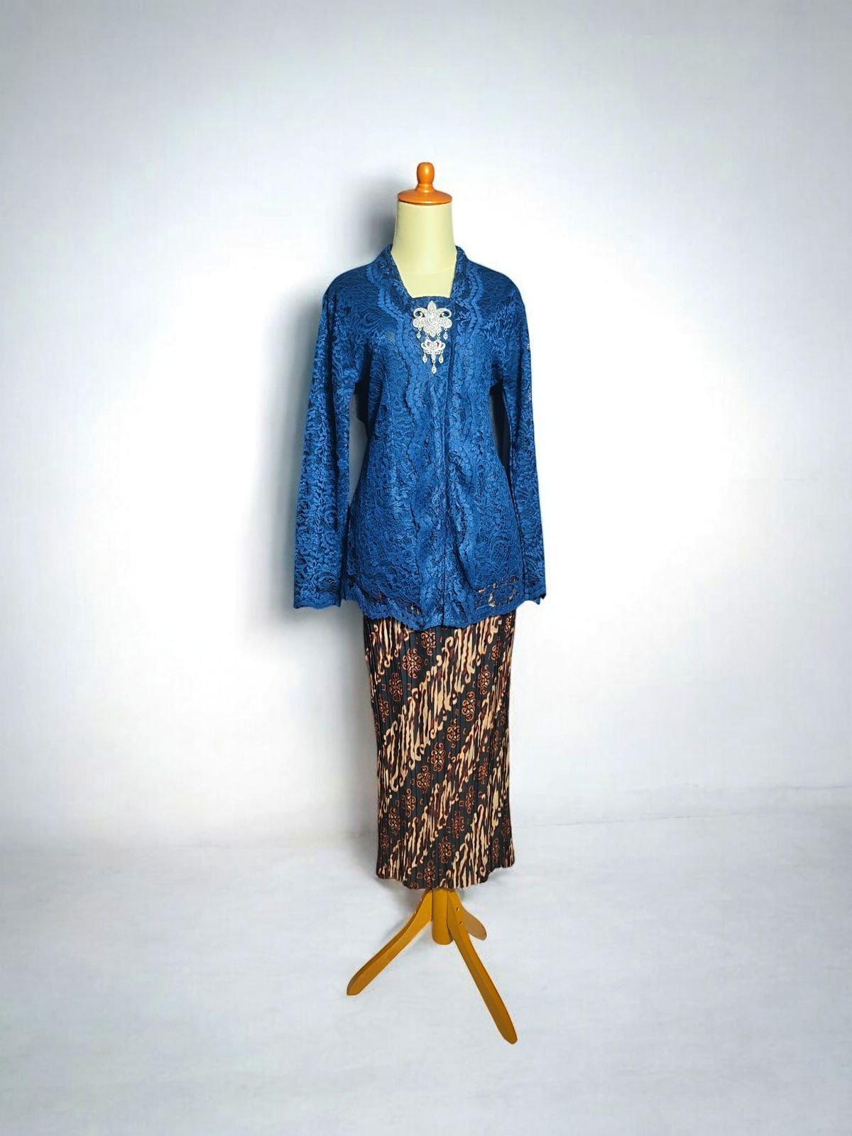 Kebaya kutubaru modern. Ciri khas utama model kutubaru adalah adanya panel kain tambahan di bagian tengah depan (disebut “bef”) yang menghubungkan sisi kanan dan kiri kebaya. Kutubaru, yang merupakan gaya tradisional dengan sentuhan kontemporer. Terbuat dari bahan brokat berwarna biru tua. Memiliki lengan panjang standar. Model seperti ini sering digunakan untuk acara formal seperti pesta, kondangan, atau wisuda.